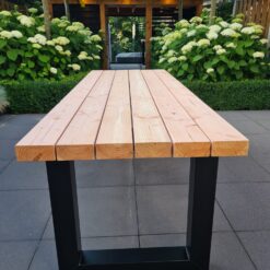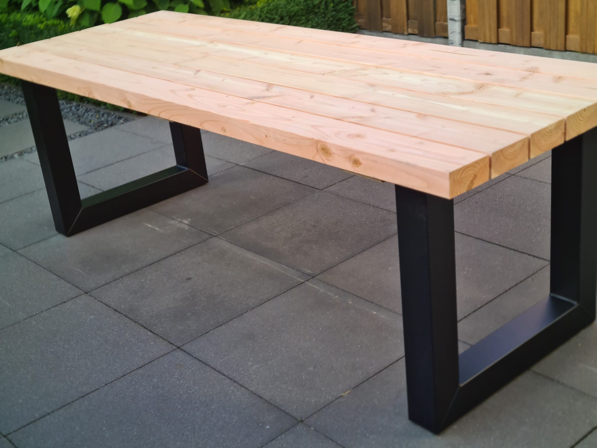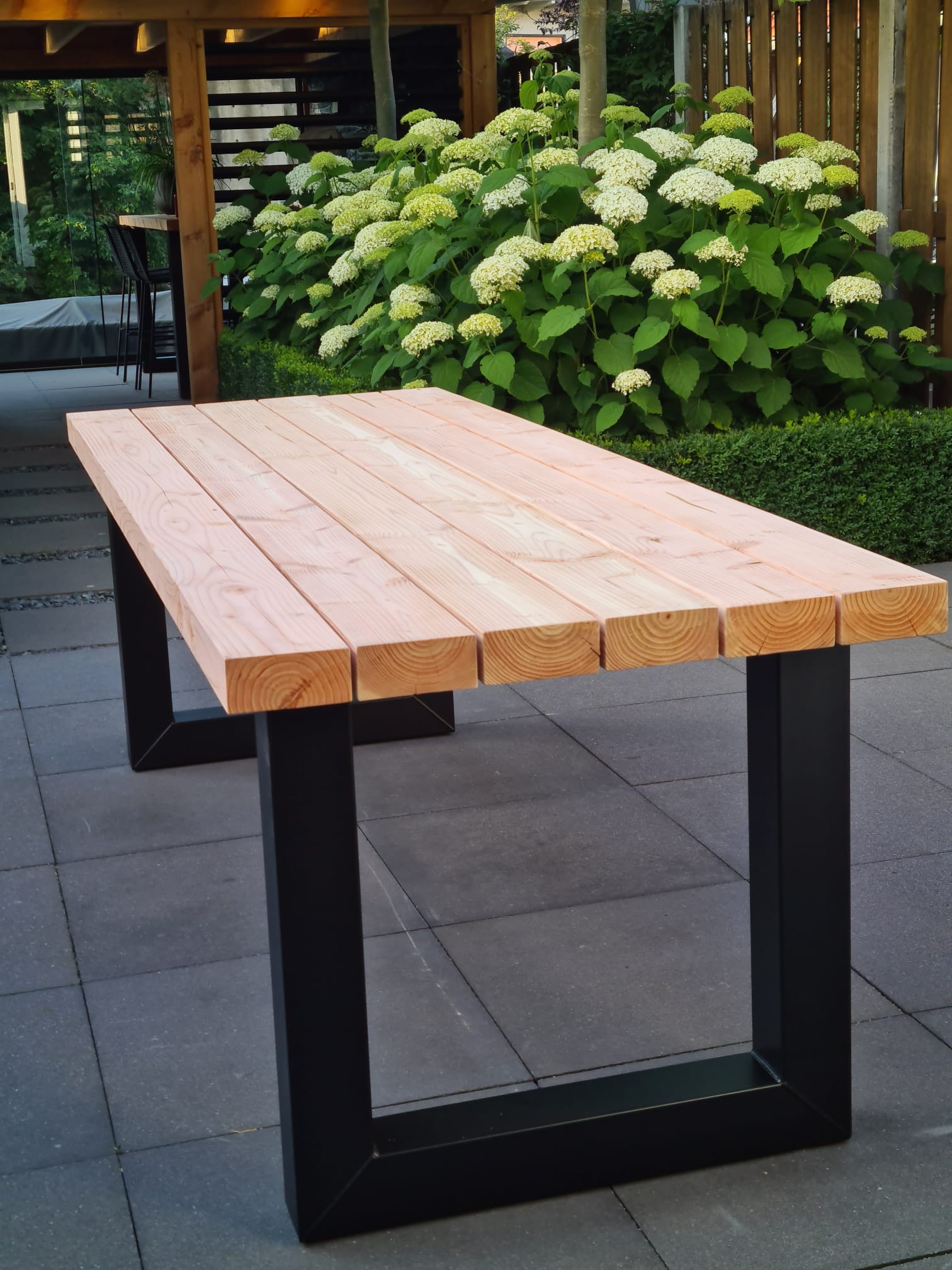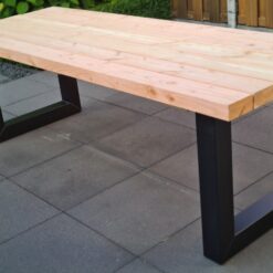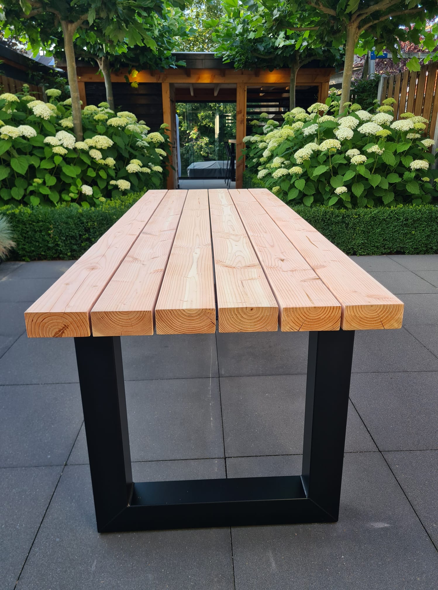 Deze mooie Douglas tafel is gemaakt uit geschaafde balken met een kopmaat van 65 x 145 mm en met 3 planken aan de onderzijde opgeklampt,