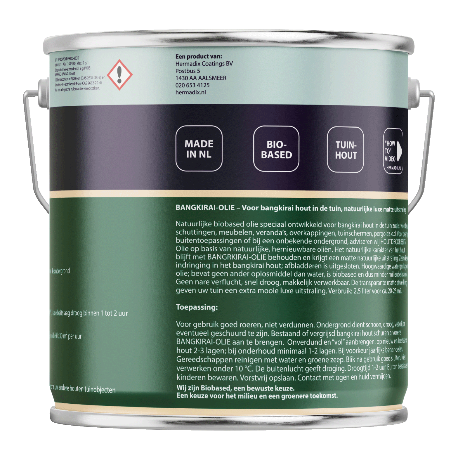 De bijzondere samenstelling op basis van speciale oliën zorgt voor een goede indringing en verankering. bladderen is uitgesloten. het natuurlijk karakter en de kleur van het hout blijft behouden. watergedragen, dus minder milieubelastend. na droging geeft Bangkirai-olie een langdurige, waterafstotende bescherming en voorkomt vergrijzing. de behandeling, met name de liggende delen, regelmatig herhalen.