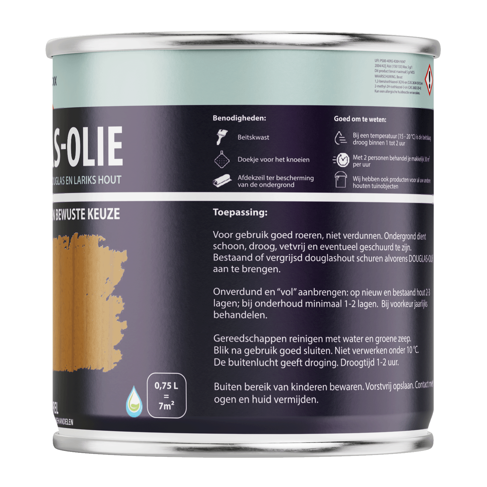 Hermadix Douglas-olie is een watergedragen, mens- en milieuvriendelijk olie op basis van natuurlijke ingrediënten, speciaal ontwikkeld voor nieuw en oud Douglas en Lariks hout. Douglas-olie geeft een mooie transparante uitstraling zodat de houtnerf- en structuur zichtbaar blijven. Douglas-olie dringt diep in het hout en geeft een matte natuurlijke uitstraling. Douglas-olie droogt snel en is makkelijk verwerkbaar.