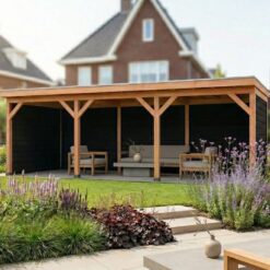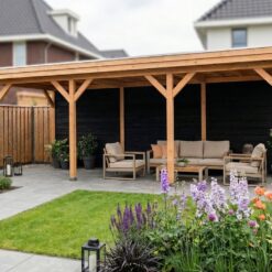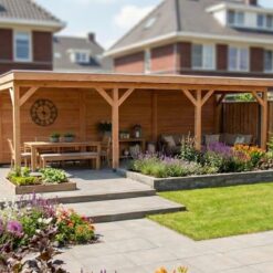 Het gebruik van duurzaam, geschaafd douglashout geeft deze constructie een warme, natuurlijke look die perfect past in zowel moderne als landelijke tuinen. De solide staanders en stevige gordingen zorgen voor stabiliteit en een lange levensduur.