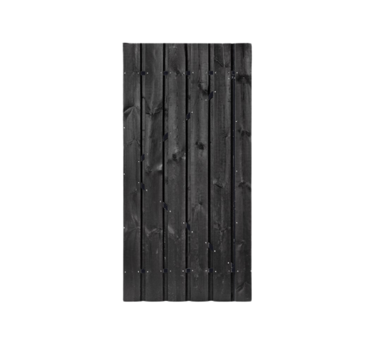 Dit framedeur van grenen hout is voorzien van 12 zwarte geschaafde planken van 16 x 140 mm,